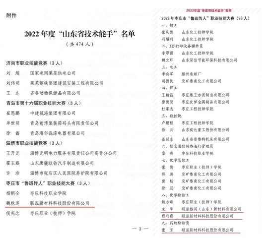 近日,山東省人力資源和社會保障廳、棗莊市人力資源和社會保障局分別公布了2022年度“山東省技術(shù)能手”名單、2022年度“棗莊市技術(shù)能手”名單。憑借在2022年棗莊市“魯班傳人”職業(yè)技能大賽的突出表現(xiàn),聯(lián)泓新材料檢驗檢測中心魏秋連被授予2022年度“山東省技術(shù)能手”榮譽稱號,檢驗檢測中心龍華、程利霞、張芳3名員工被授予2022年度“棗莊市技術(shù)能手”榮譽稱號。