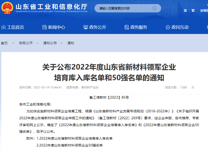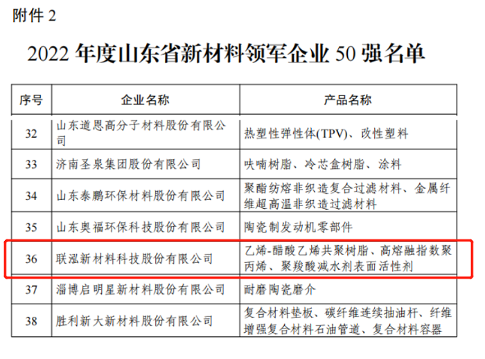 5月17日,山東省工業(yè)和信息化廳公布《2022年度山東省新材料領軍企業(yè)培育庫入庫名單和50強名單》。聯(lián)泓新材料再次上榜“山東省新材料領軍企業(yè)50強”。