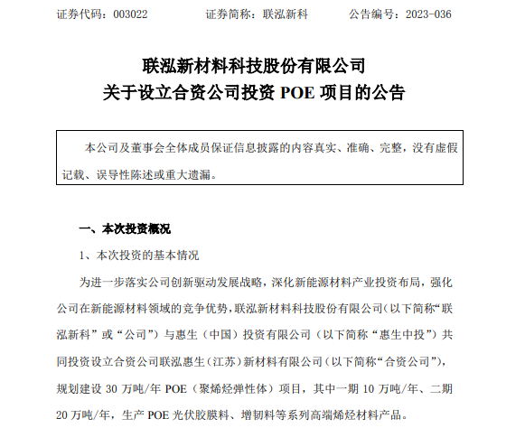 8月23日,聯(lián)泓新材料科技股份有限公司與惠生(中國(guó))投資有限公司共同投資設(shè)立了聯(lián)泓惠生(江蘇)新材料有限公司。其中,聯(lián)泓新科出資4.55億元,占合資公司注冊(cè)資本的65%;惠生中投出資2.45億元,占合資公司注冊(cè)資本的35%。聯(lián)泓惠生新材料主要從事POE(聚烯烴彈性體)等高端烯烴材料業(yè)務(wù),規(guī)劃建設(shè)30萬(wàn)噸/年P(guān)OE項(xiàng)目,其中一期10萬(wàn)噸/年、二期20萬(wàn)噸/年,生產(chǎn)POE光伏膠膜料、增韌料等高端產(chǎn)品。
