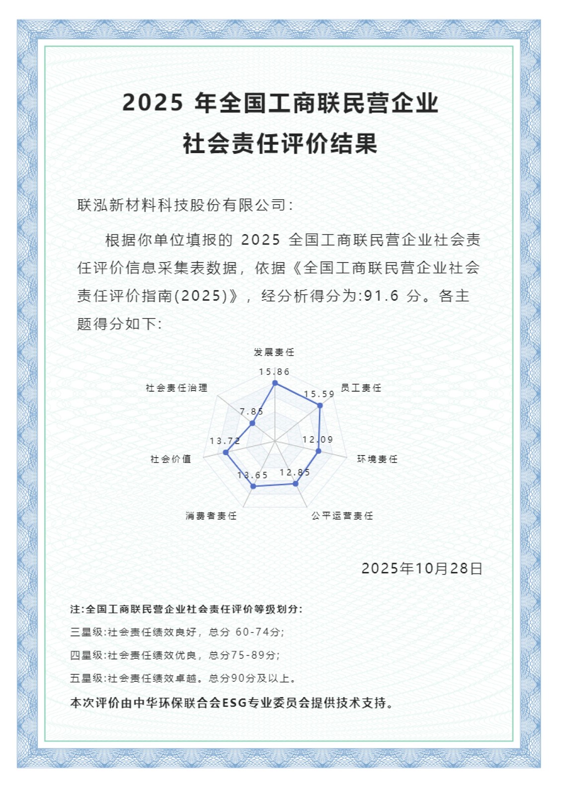 聯(lián)泓新科獲全國(guó)工商聯(lián)民營(yíng)企業(yè)社會(huì)責(zé)任評(píng)價(jià)最高等級(jí)“五星級(jí)”